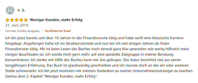 Viele Finanzberater haben nicht den gewünschten Erfolg und sind ständig auf der Suche nach neuen Kunden. Der Grund für den ausbleibenden Erfolg liegt in der falschen Strategie. Statt immer mehr Kunden zu beraten und ein immer größeres Produktportfolio anzubieten, gilt es, eine intelligente Strategie zu verfolgen, um mit weniger Kunden mehr Umsatz zu generieren. Viel mehr Umsatz.